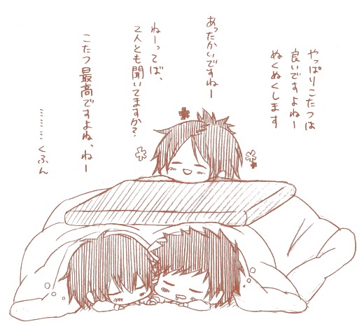 こたつってなんでこうも出られなくなるんでしょうね。そんな感じでこたつでぬくぬくしながら絵描いてたら絵もぬくぬくしてしまった